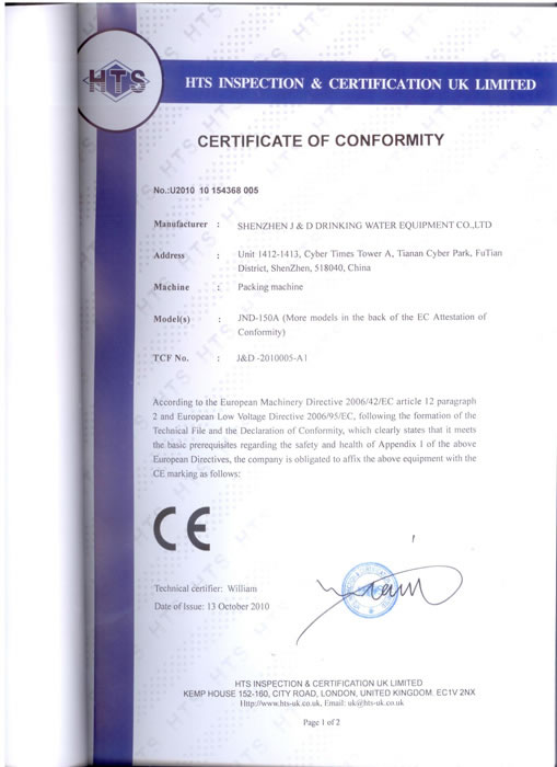 Certificação CE da Máquina de Enchimento (Máquina Envasadora)